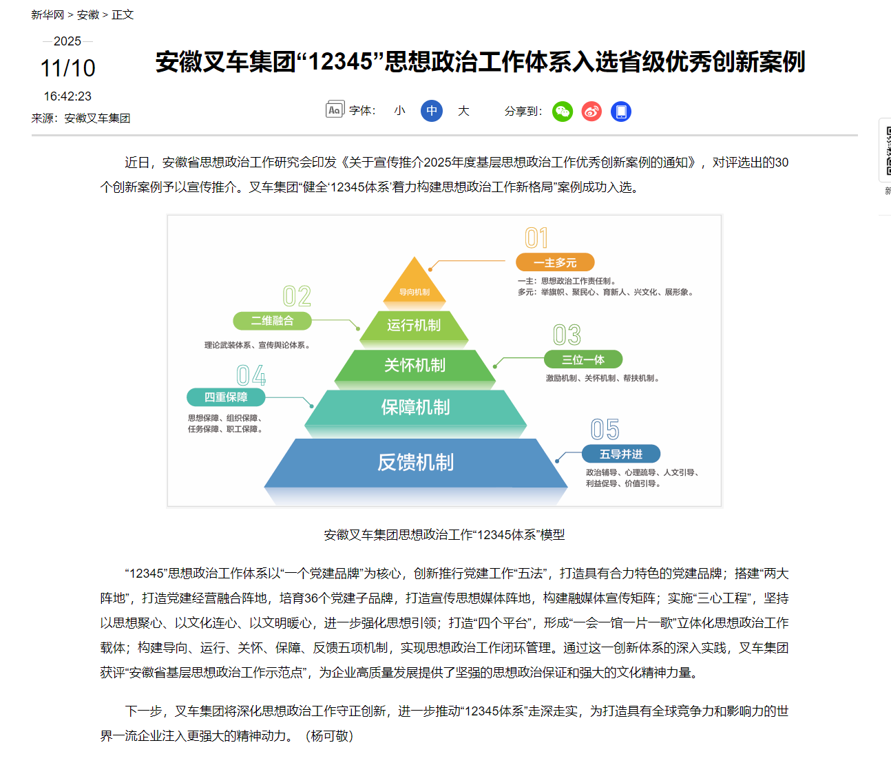 查看詳情 >【新華網】安徽叉車集團“12345”思想政治工作體系入選省級優秀創新案例