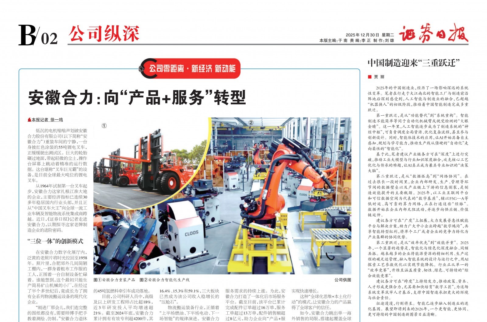 走進安徽合力股份有限公司(安徽叉車集團核心控股子公司)新能源智能工業車輛產業園內,記者看到裝配車間的焊接機器人正依據指令精準地進行車輛焊接。在總控室的大屏幕上,每臺設備的運行參數、能耗數據正實時變動,AI系統會根據訂單數量自動調整生產節奏。 ...